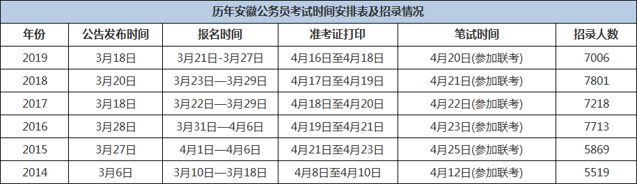 具體時(shí)間安排則要以2020年安徽公務(wù)員公告為準(zhǔn),歷年安徽省公務(wù)員考試時(shí)間安排及招錄情況供大家參考(如下圖):
