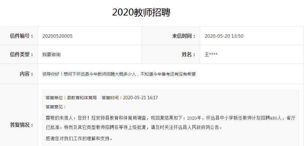 尊敬的來信人:您好!經(jīng)安排縣教育和體育局調(diào)查,現(xiàn)回復(fù)結(jié)果如下:2020年,懷遠縣中小學(xué)新任教師計劃招聘480人,省廳已批準。特崗及其它類型教師招聘在等待上級批復(fù),請及時關(guān)注懷遠縣人民政府網(wǎng)公告。