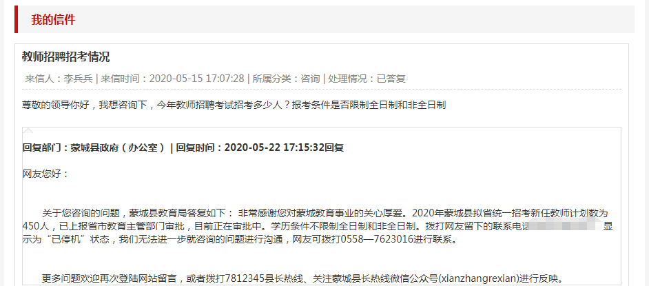 更多問題歡迎再次登陸網(wǎng)站留言,或者撥打7812345縣長熱線、關(guān)注蒙城縣長熱線微信公眾號(xianzhangrexian)進行反映。