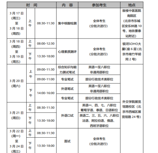 近年來,外交部的面試形式均為結(jié)構(gòu)化面試,面試時間為20-30分鐘,題量4-11題,考官讀題。除了面試之外,還需進行相應(yīng)的專業(yè)能力測試和心理素質(zhì)測試,其中專業(yè)能力測試包括綜合知識與能力測試(筆試)、專業(yè)筆試、外語筆試、外語口試;心理素質(zhì)測試分批次進行,不計入綜合成績。