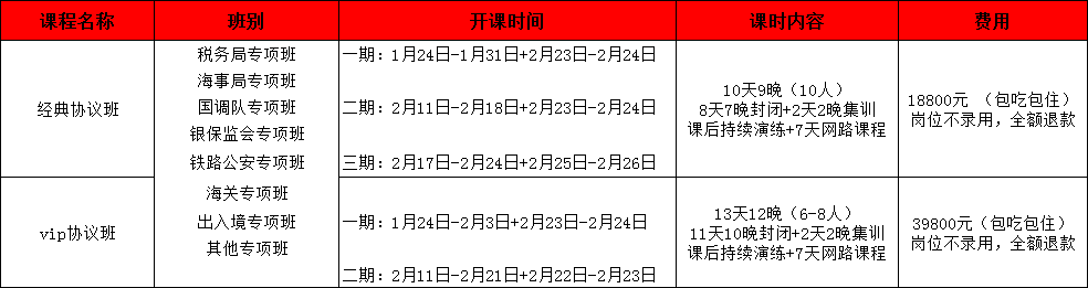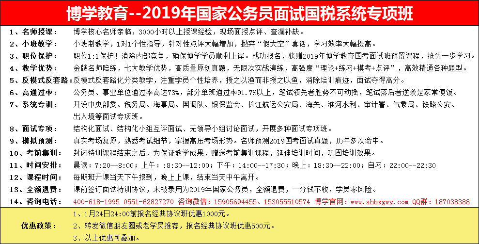 詳見協(xié)議(包括培訓(xùn)費(fèi)、教材費(fèi)、住宿費(fèi)、餐費(fèi)、水果點(diǎn)心費(fèi)等一切費(fèi)用)。學(xué)員無(wú)論任何情況未被錄用為2019年國(guó)家公務(wù)員,我校將退還全部費(fèi)用。